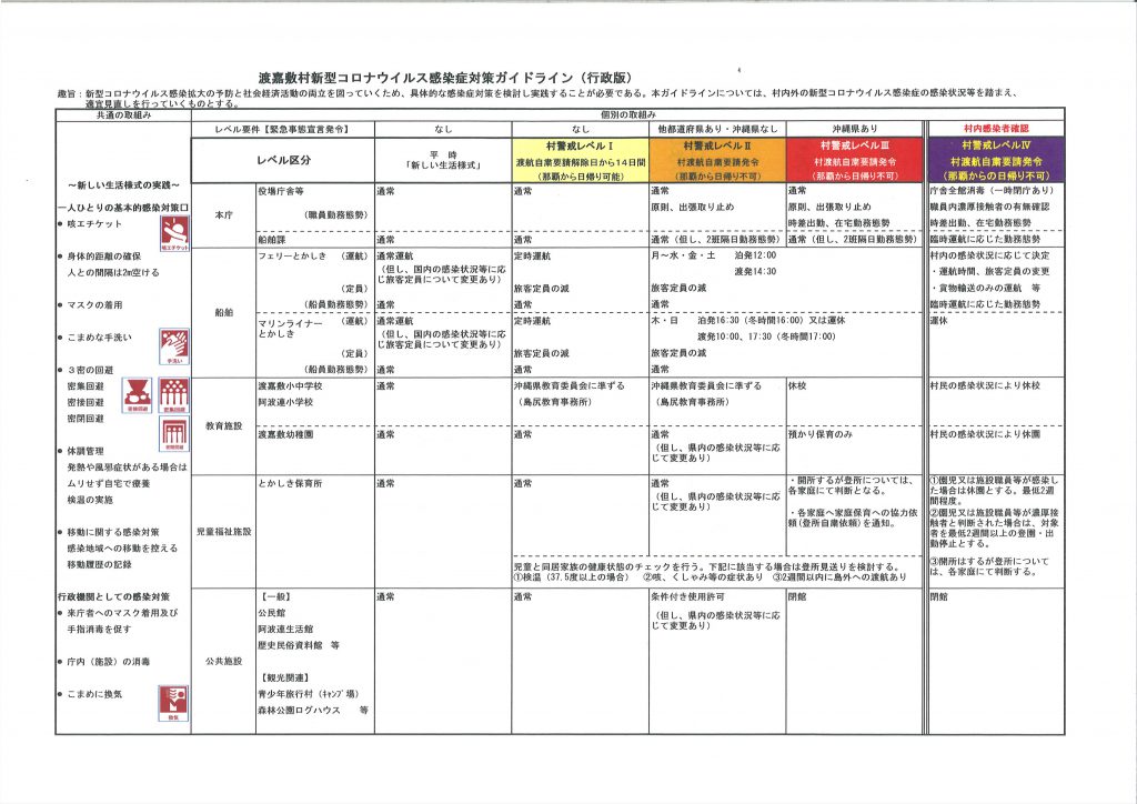 渡嘉敷村新型コロナウイルス感染症対策ガイドライン(行政版) 更新日:2024年03月26日 ページ番号 : 2606 渡嘉敷村新型コロナウイルス感染症対策ガイドライン(行政版) 拡大画像 (PDFファイル: 193.7KB) この記事に関するお問い合わせ先 渡嘉敷村役場沖縄県島尻郡渡嘉敷村字渡嘉敷 183電話:098-987-2321