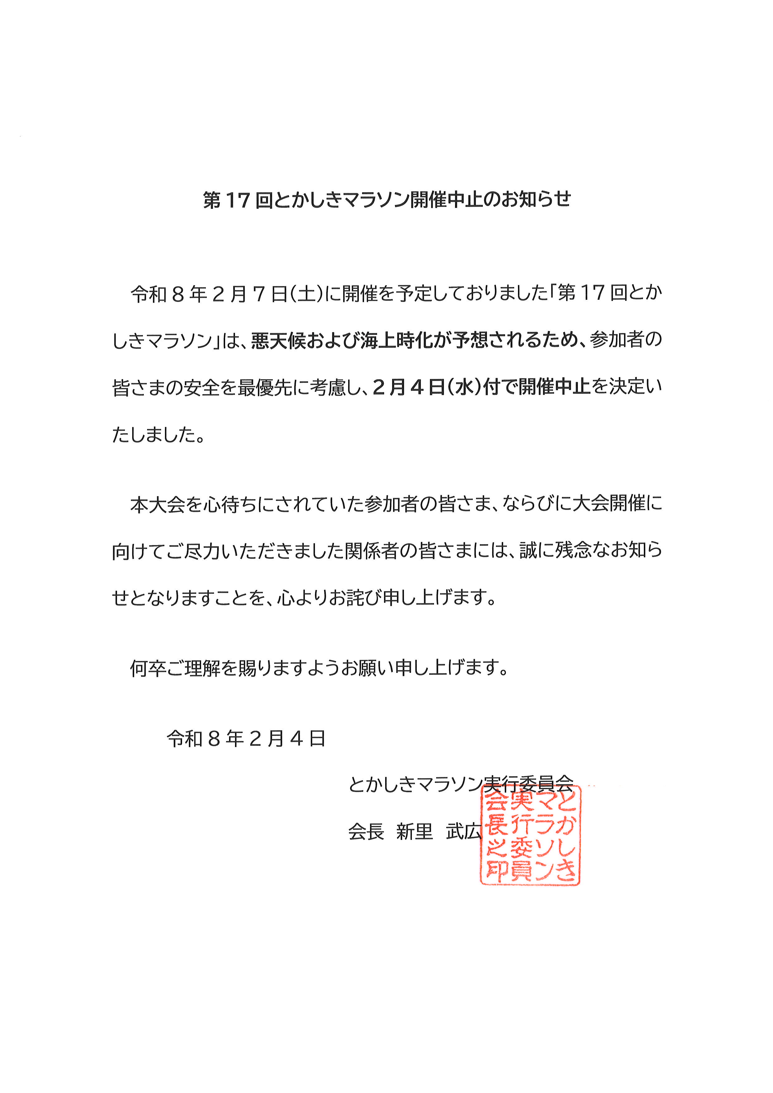令和8年2月7日(土曜日)に開催を予定しておりました「第17回とかしきマラソン」は、悪天候および海上時化が予想されるため、参加者の皆さまの安全を最優先に考慮し、2月4日(水曜日)付で開催中止を決定いたしました。